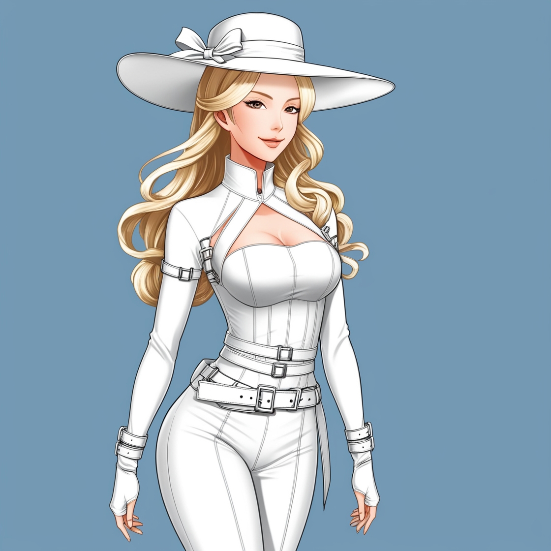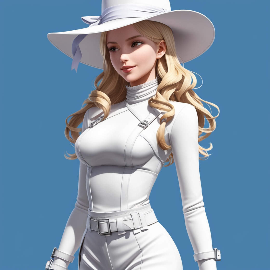 Digital illustration featuring a stylish, anime-inspired character. The subject is a woman with long, wavy blonde hair cascading down her shoulders, wearing a wide-brimmed white hat adorned with a ribbon. She has fair skin and a confident expression, with her gaze directed to the side. Her outfit is a sophisticated, all-white ensemble consisting of a high-necked, long-sleeved top with intricate detailing and a pair of high-waisted pants secured with a wide belt. The clothing features multiple straps and buckles, adding a touch of complexity and elegance to the design. The background is solid black, which contrasts sharply with the light tones of her attire, making her figure stand out prominently.